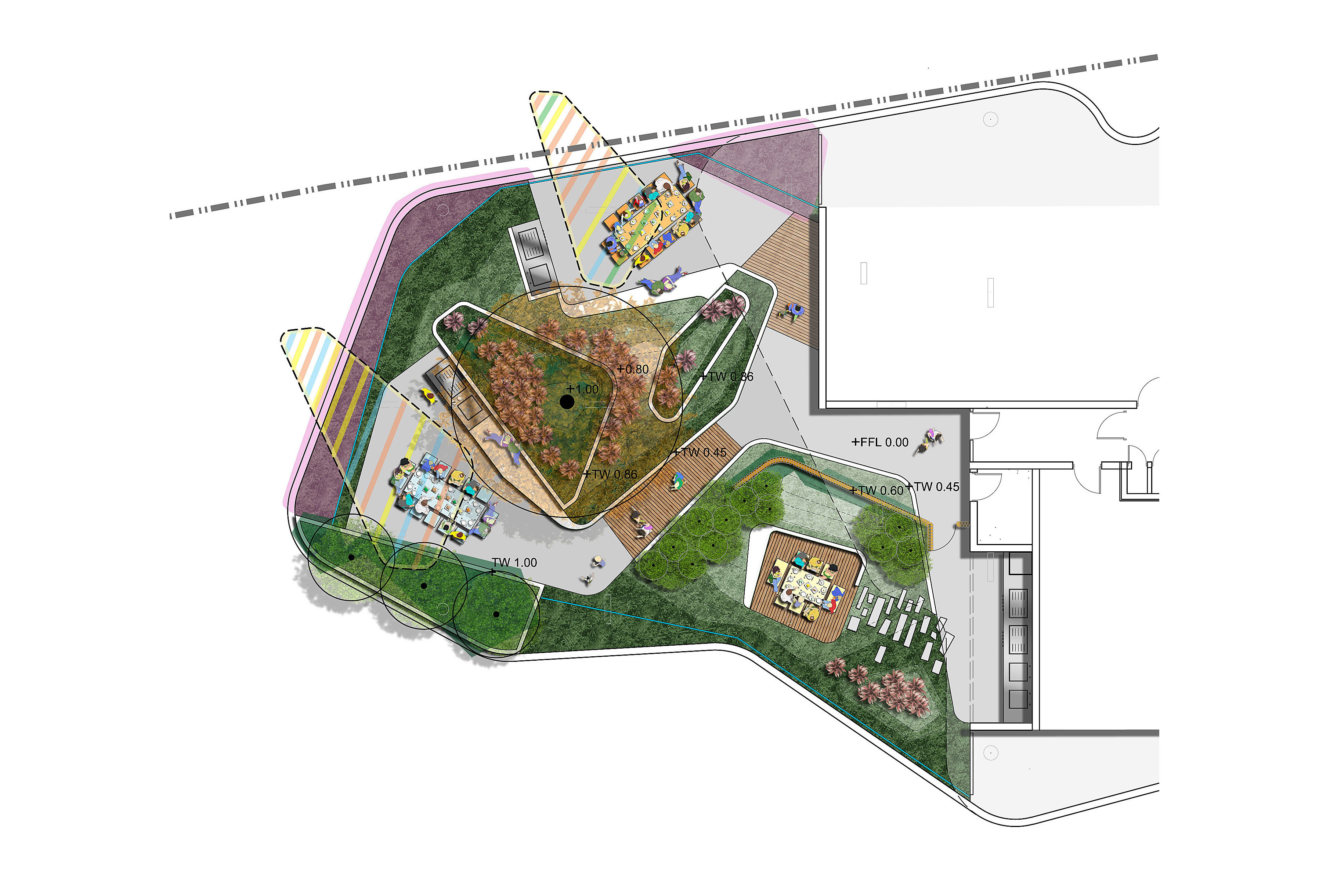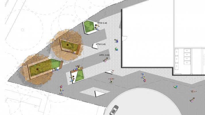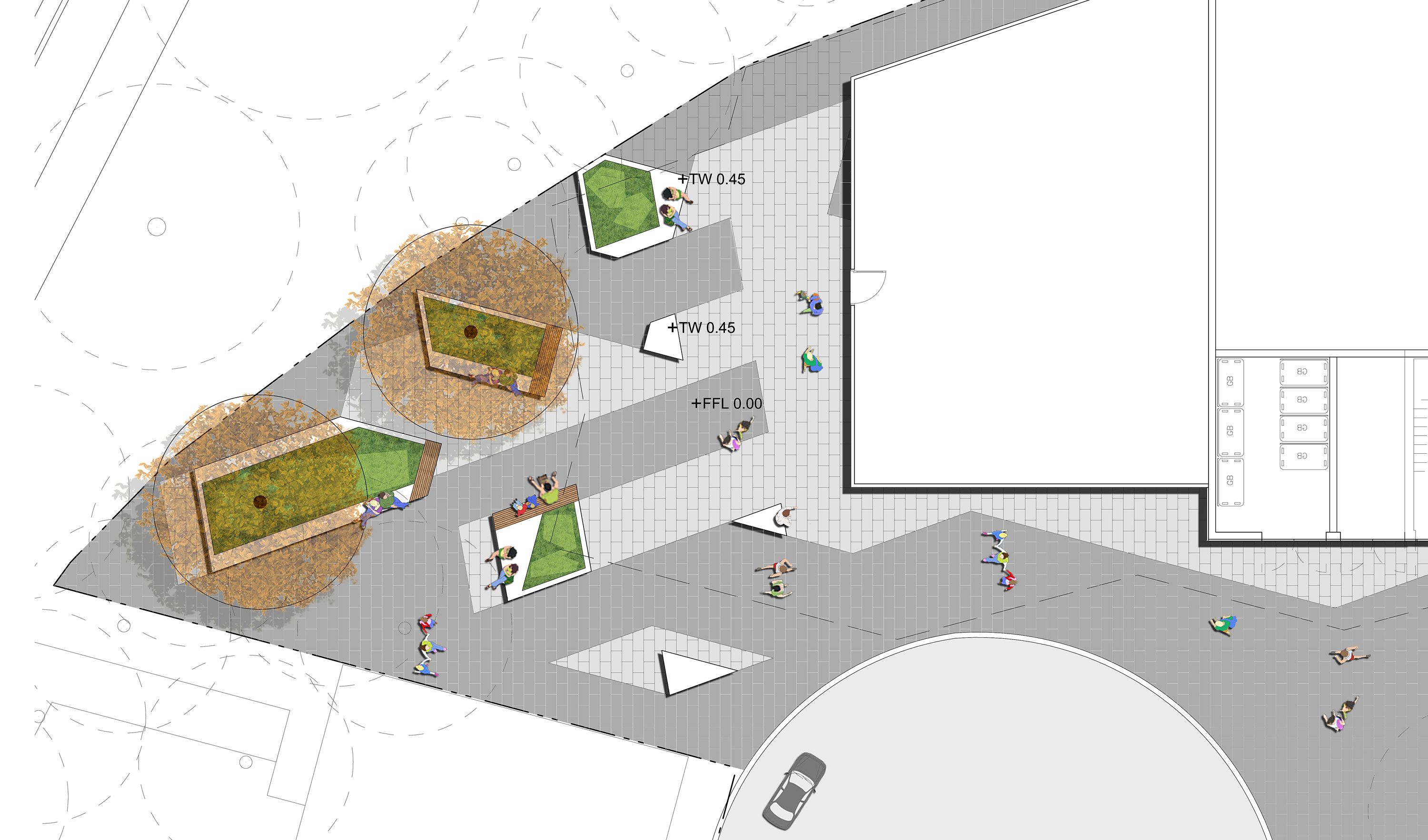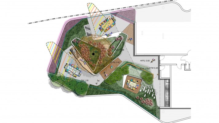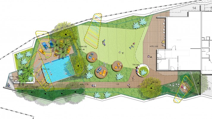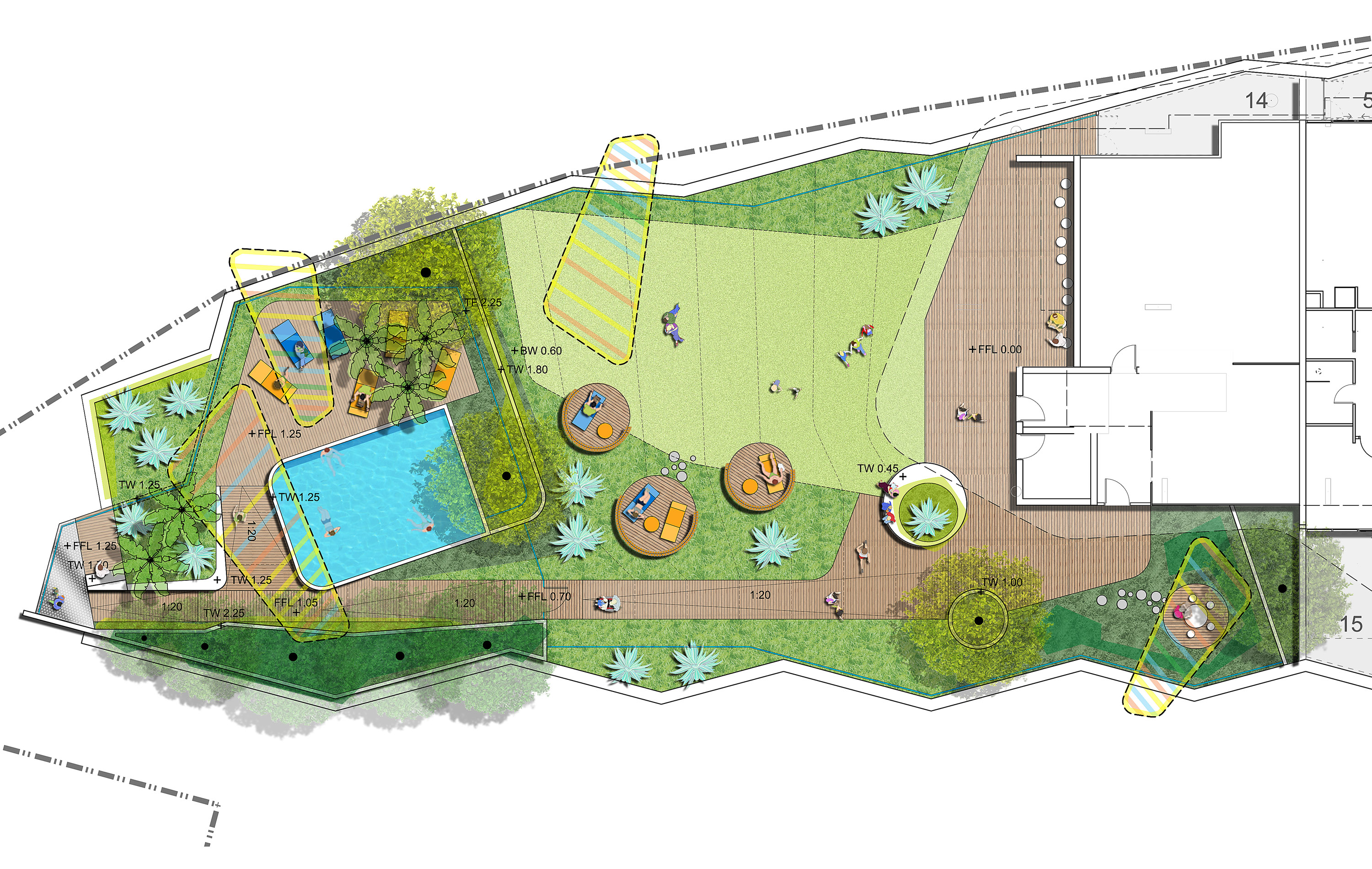 This prominent building is part of the Diversity project in Waterloo with a Turner Architects building requiring a level 3 800m2 private communal green leisure area.  Including a bar area, spacious deck adjoining a large lawn area. Bounded by native grasses, Wi Fi enabled ‘recluse pods,’ colourful custom shade structures and a pool area with extensive views beyond the site. Also level 6 outdoor dining areas, the Becton property Group brief was for 3 completely separated ‘12 person bookable dining areas.’ At street level the public domain set out includes planting, casual seating.