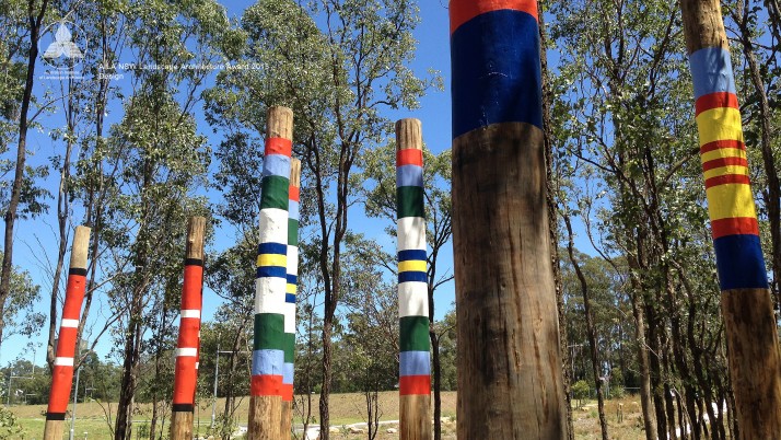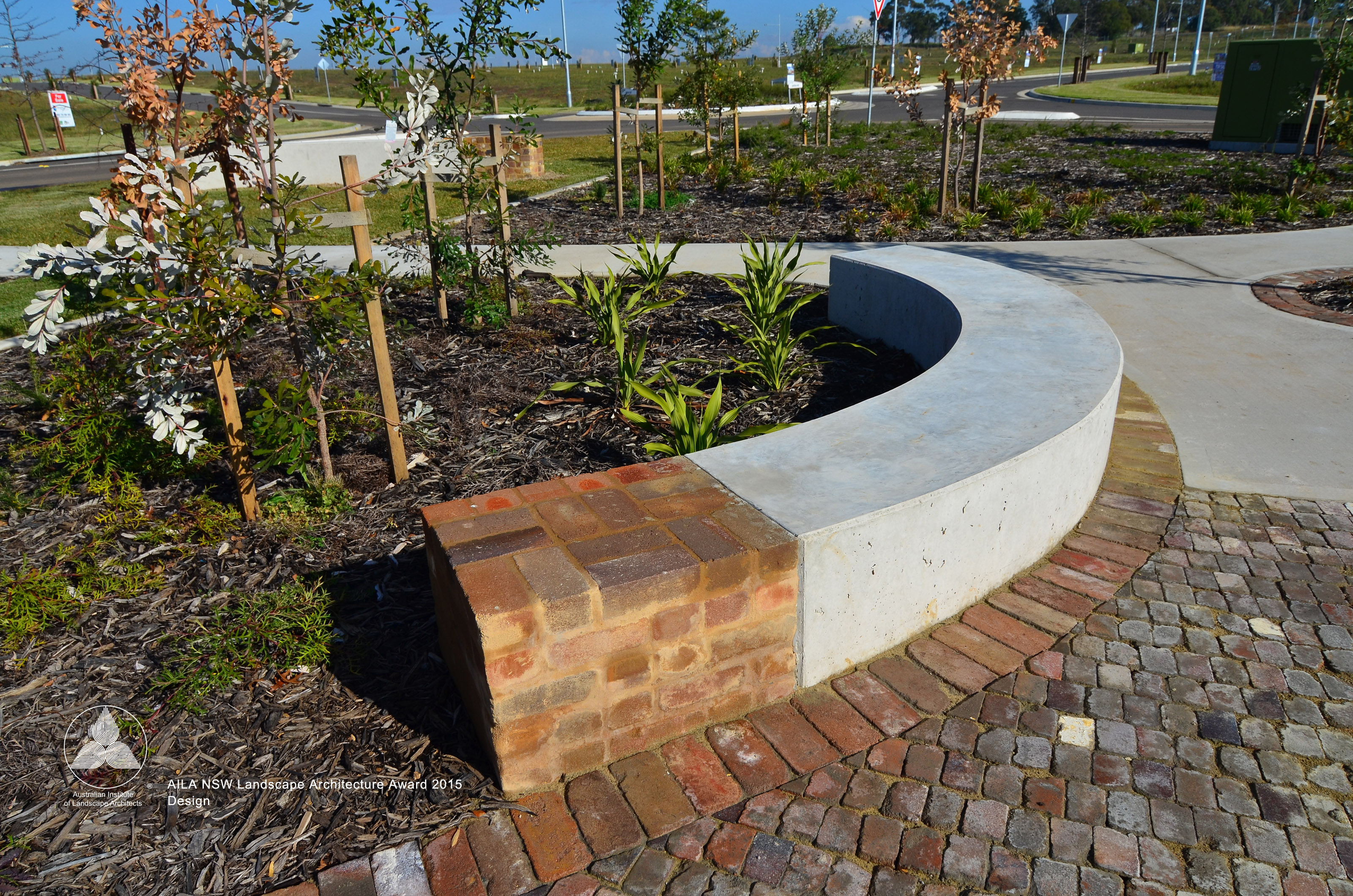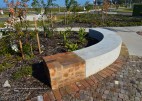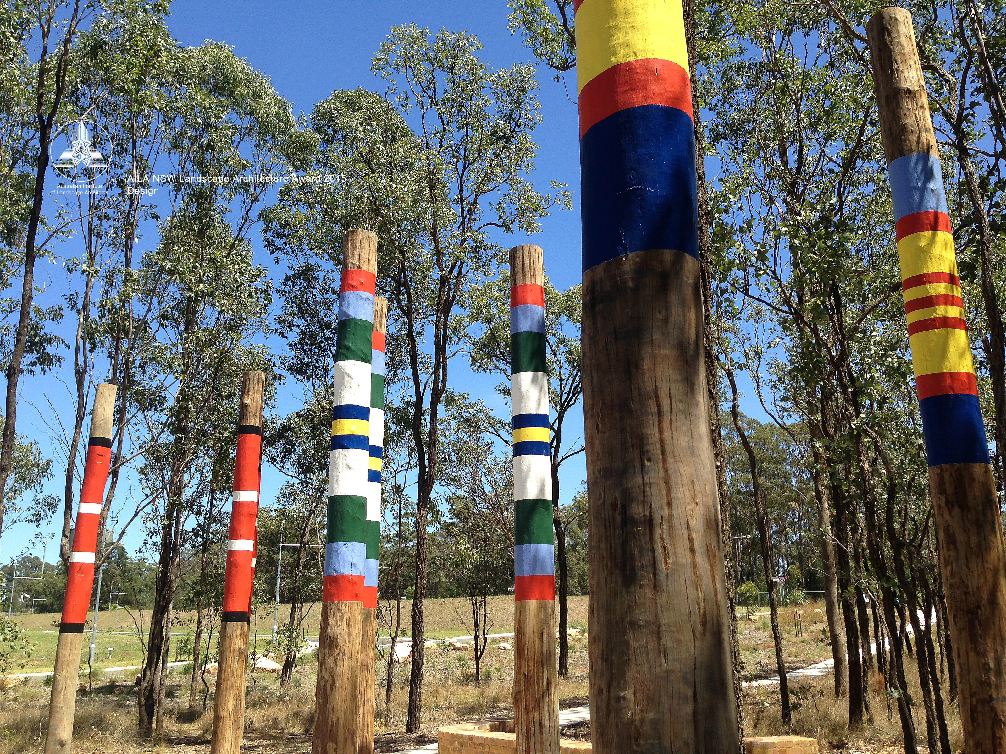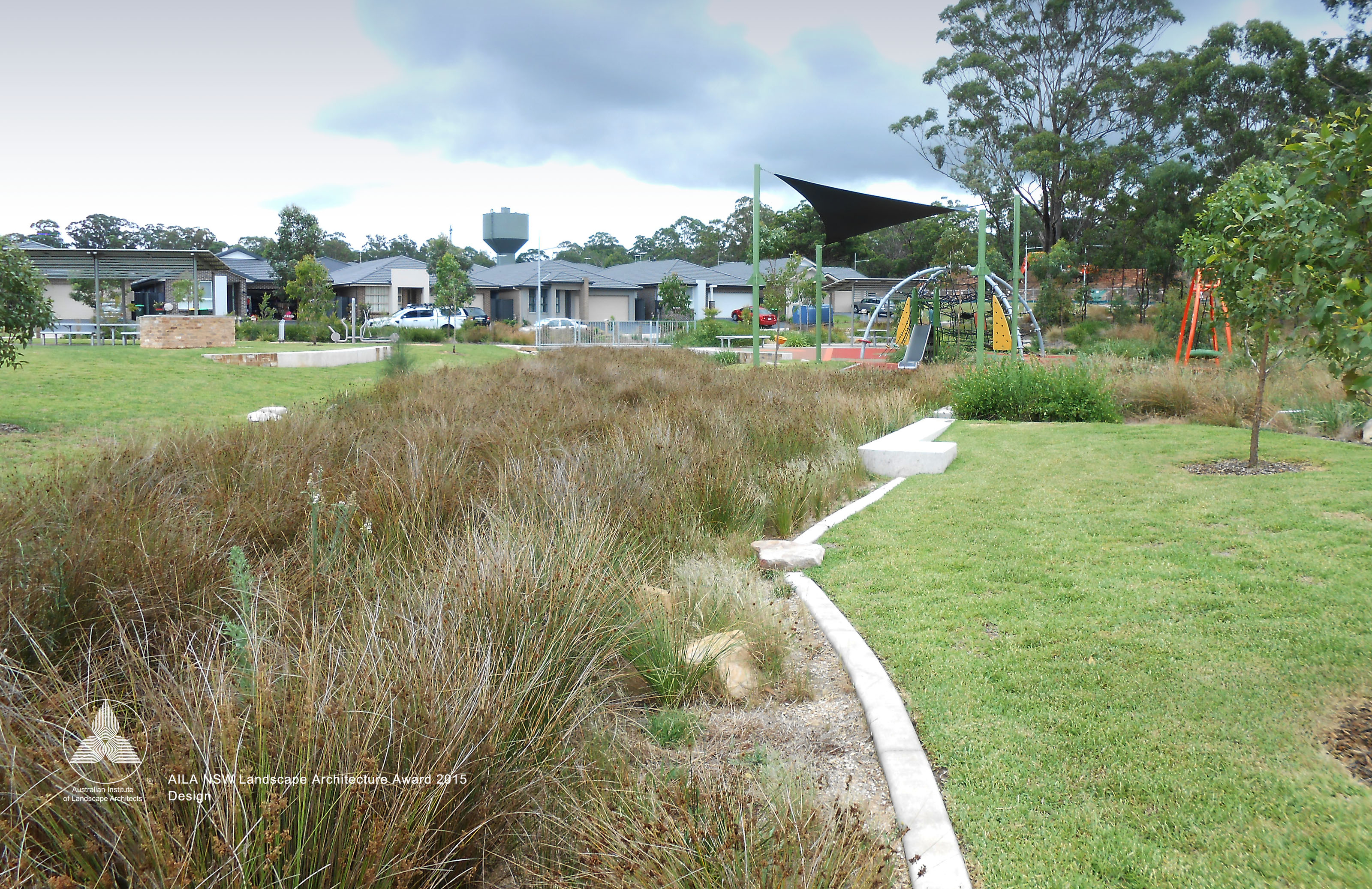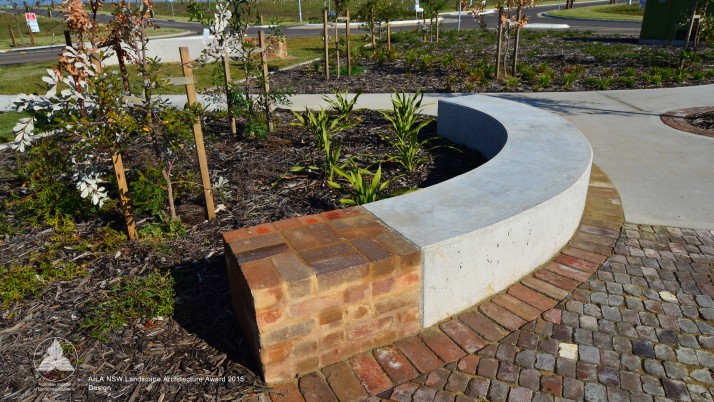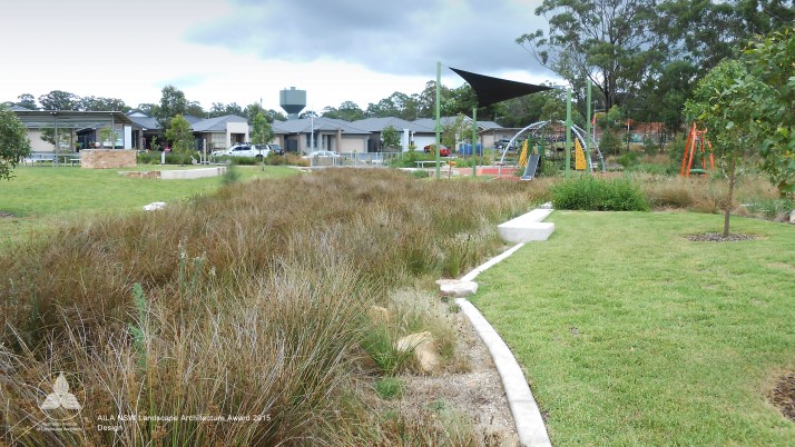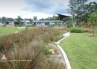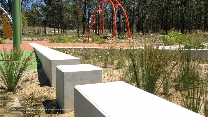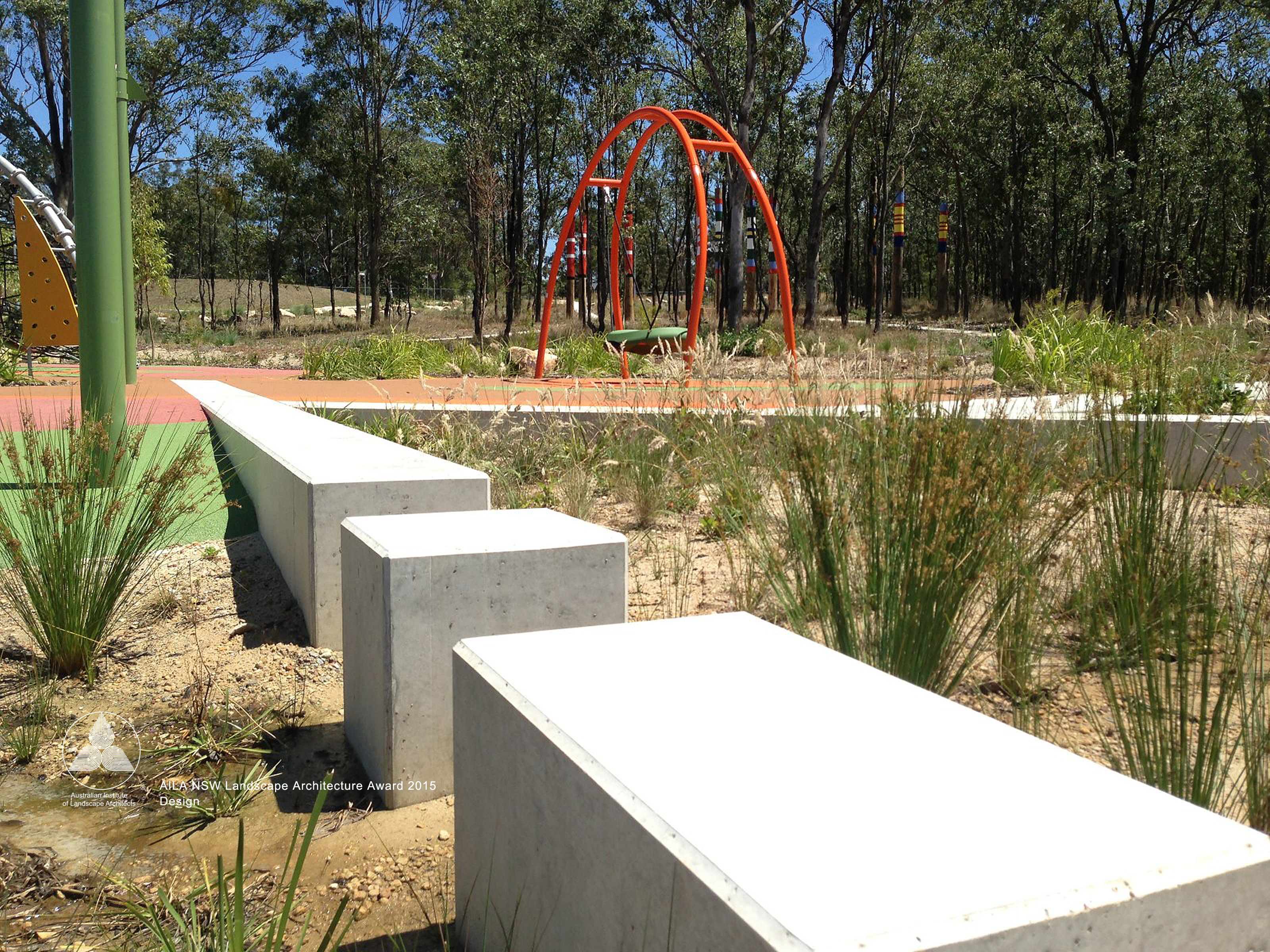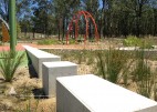 Brigade Park, within Landcom’s Edmondson Park development is an engaging, native landscape providing a variety of activities; a fitness circuit, adventure play, bush trails and commuter path. The lower part of the park accommodates more active components in addition to BBQ, shelters, seating and a kick-around lawn. A remnant area of Cumberland Plain Woodland is enhanced with endemic plantings, with access paths carefully located. Public art is integrated into the park and is based on commemorative military medals and ribbons, with bandings of glazed brick and painted totems.