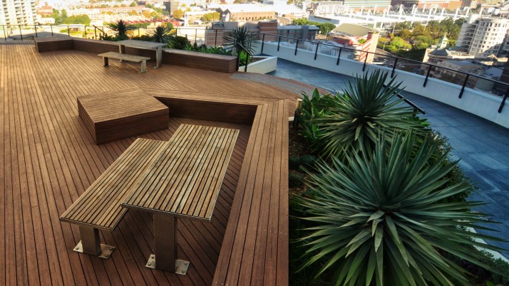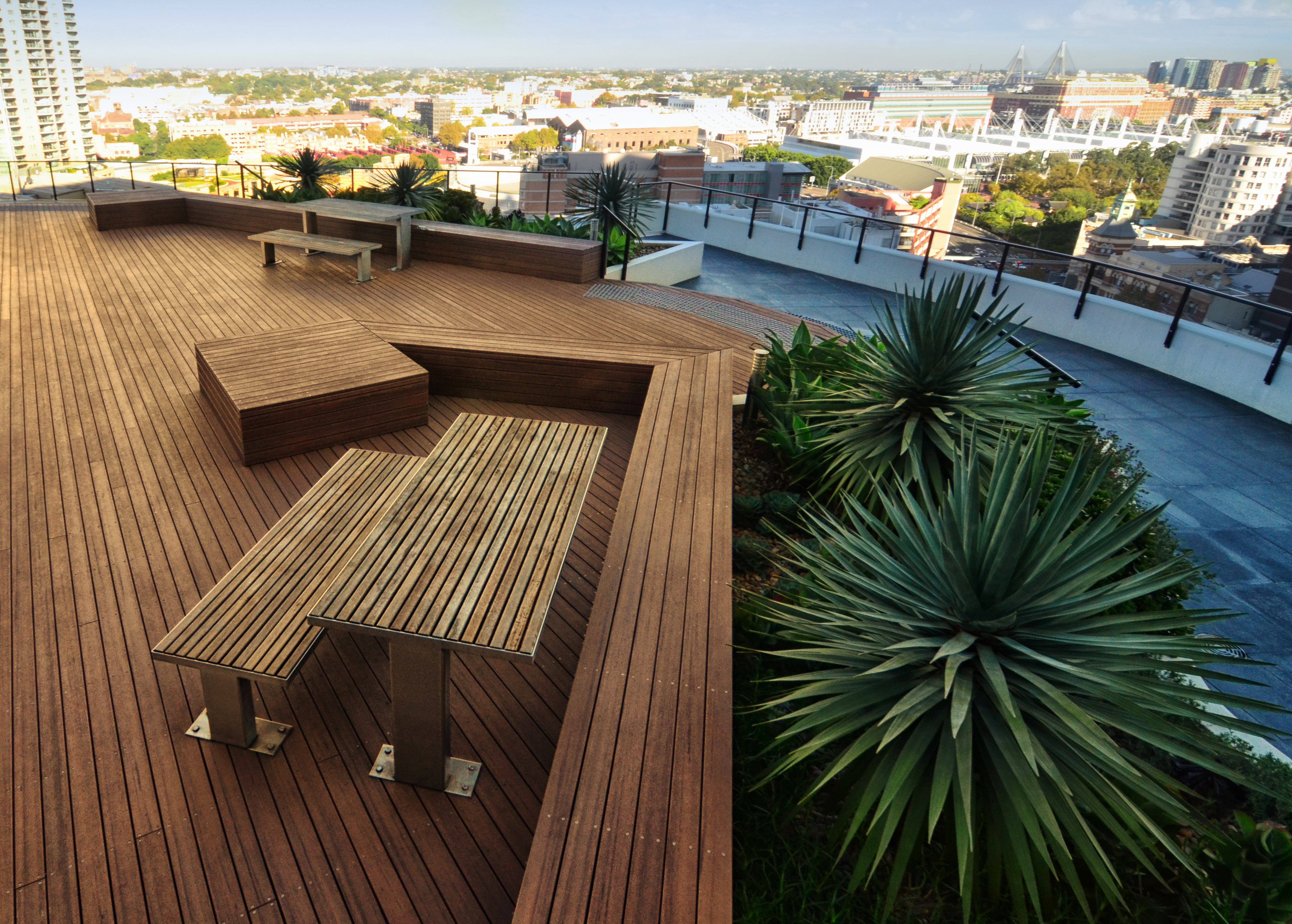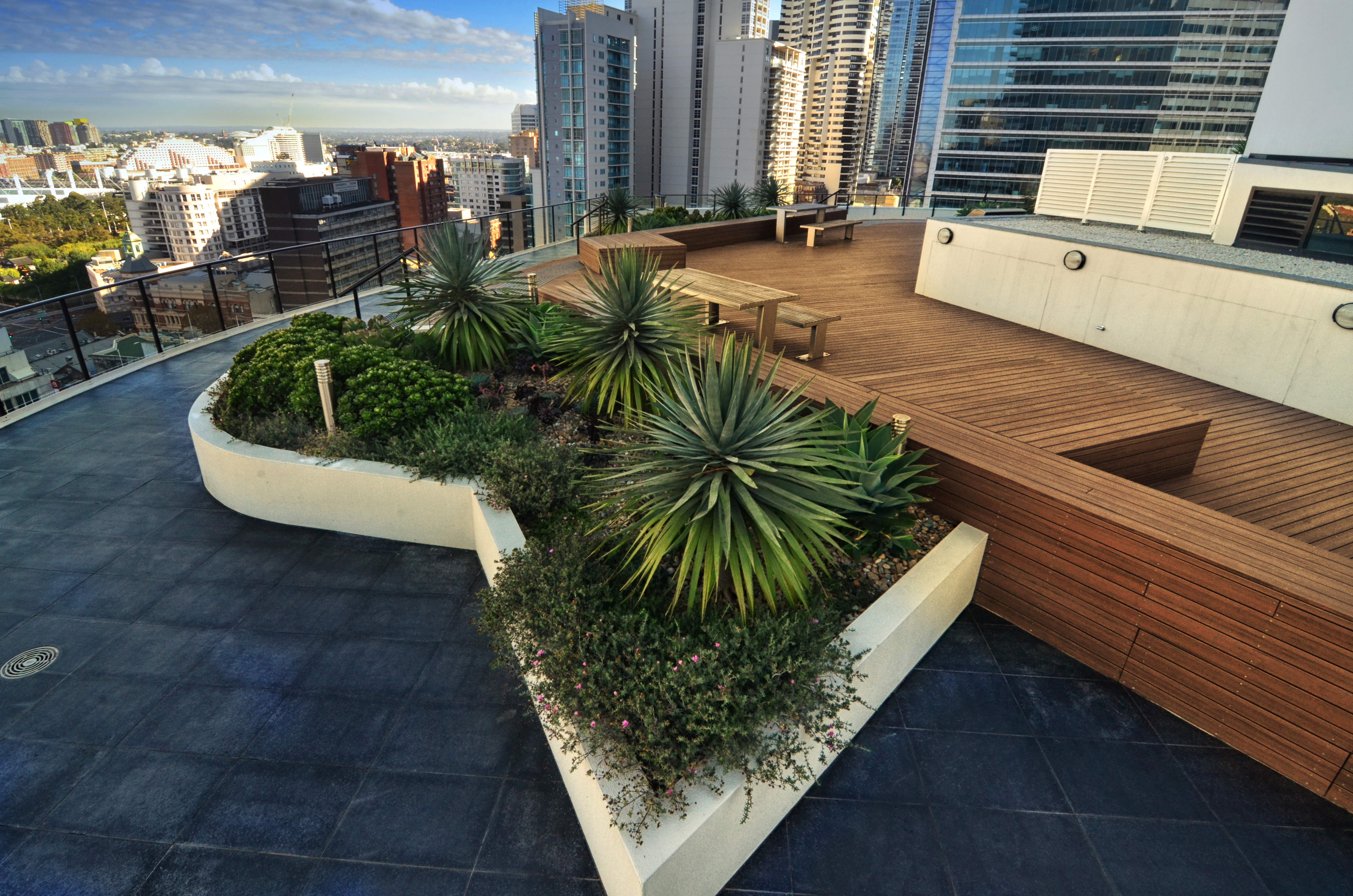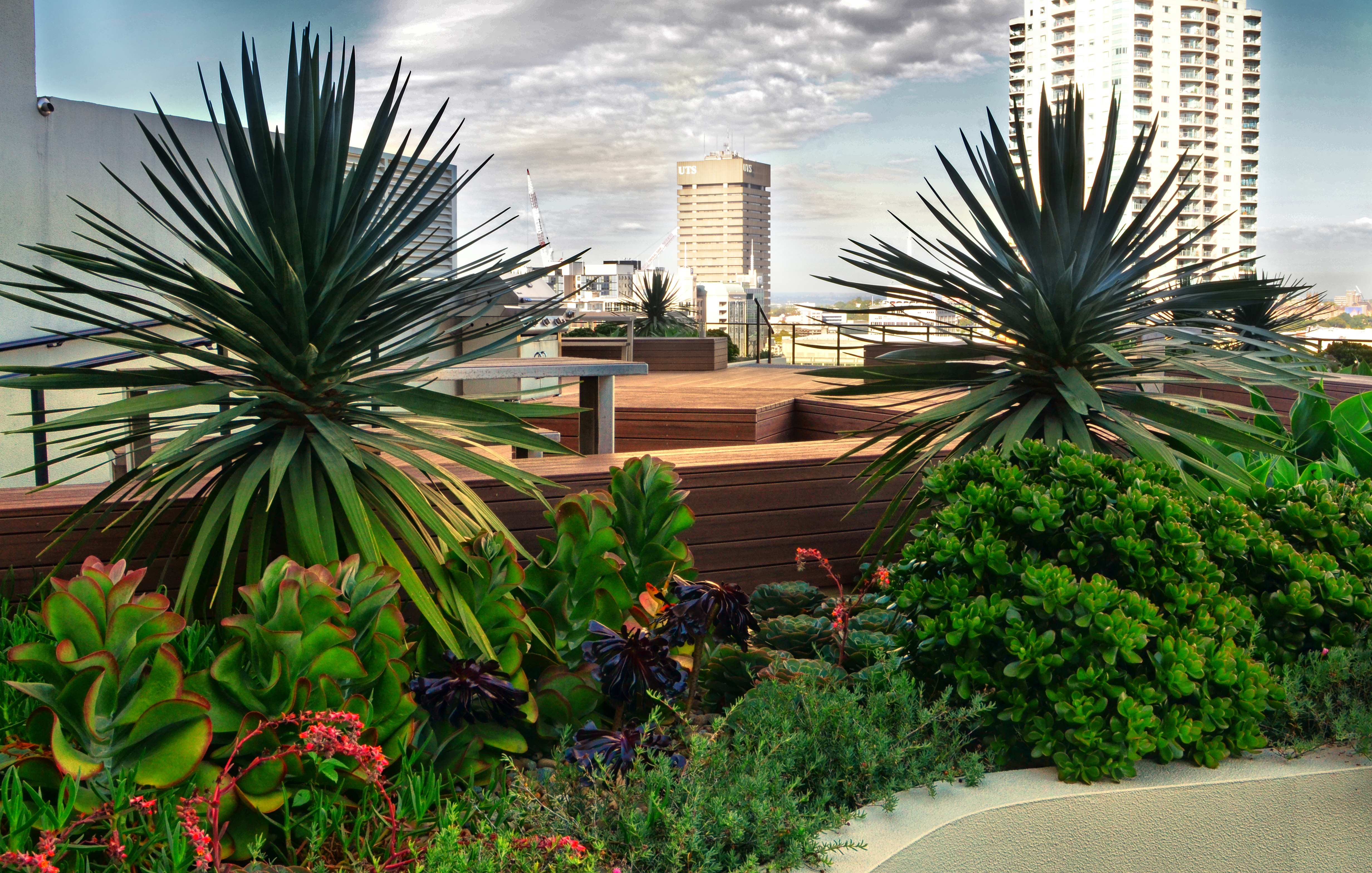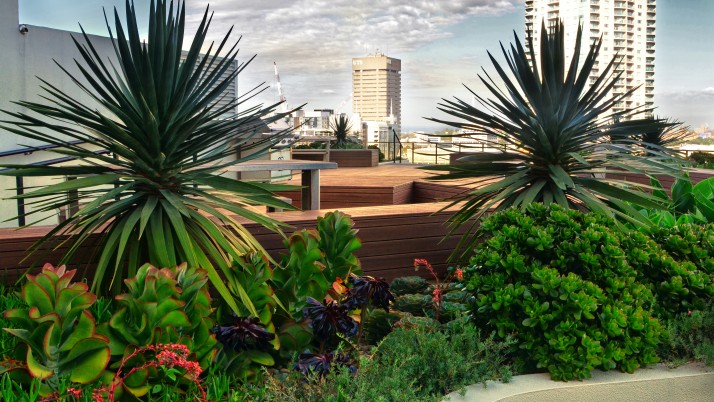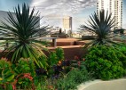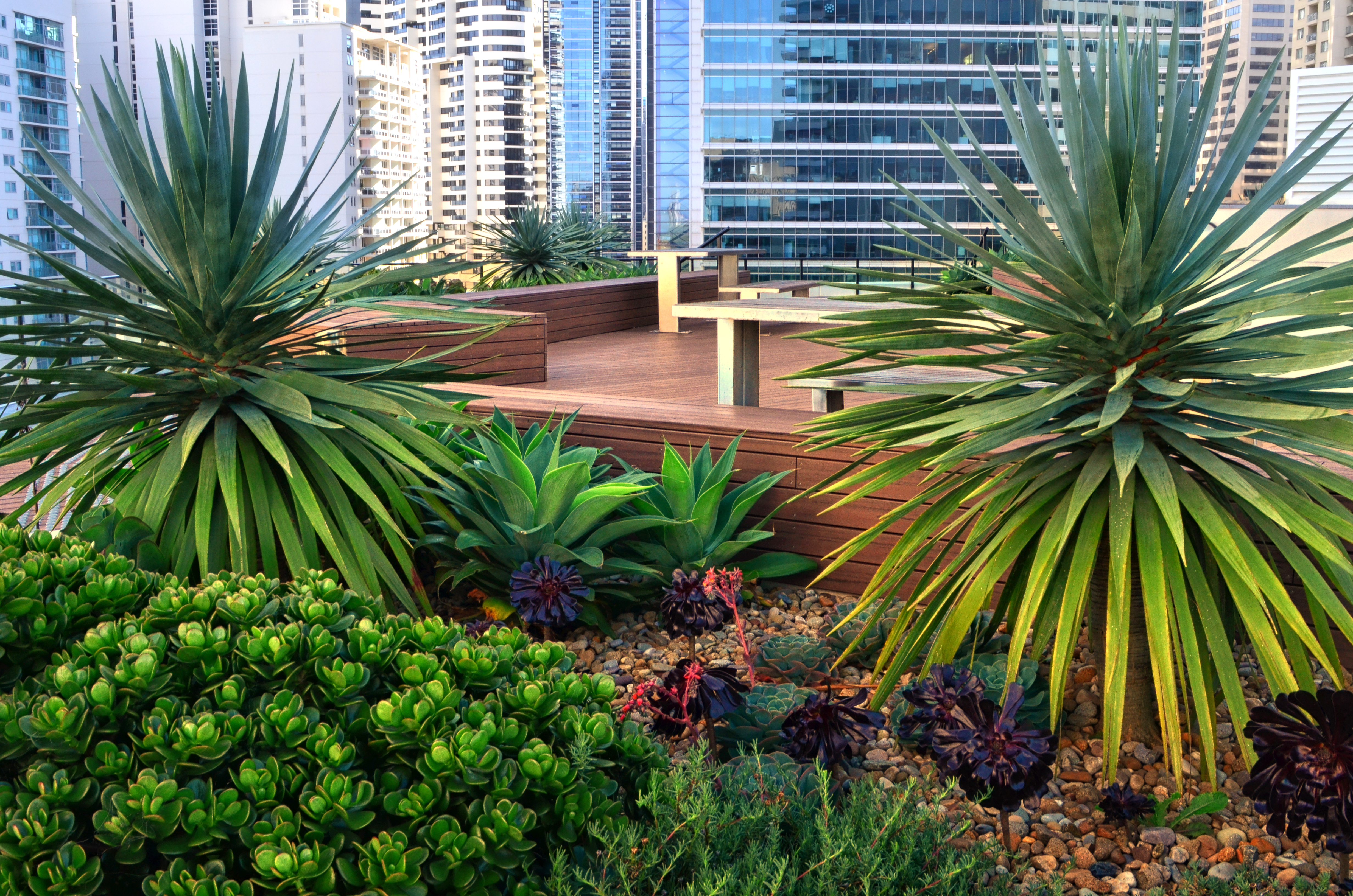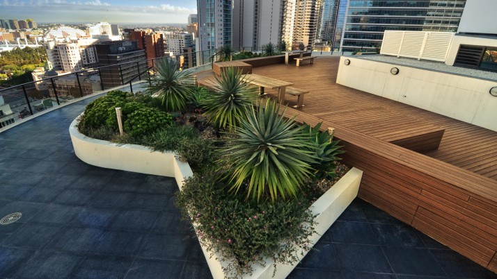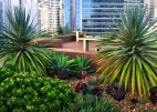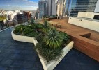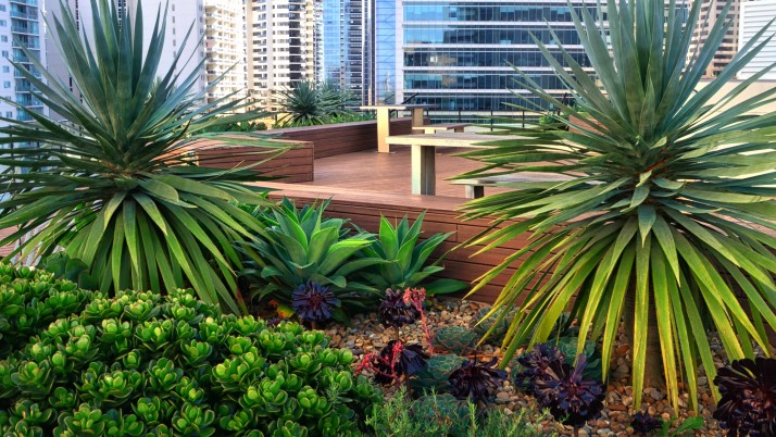 The landscape within this 19 storey commercial and residential highrise by Inmark includes a retail atrium, green wall and roof terrace. With a 3 storey green wall, the atrium has planter boxes supporting a range of climbers trained up a wire trellis; creating a green frame to the coloured glass louvres designed by Robert Owen. The roof terrace with timber decking & custom design seating is planted with a range of succulents with strong architectural forms including Dragon Trees, Agaves, Echeveria, Kalanchoe and the striking Yucca elephantipes.